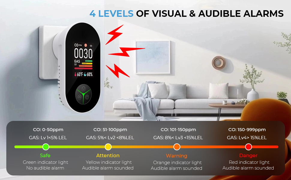 - * <b>【Visuele en hoorbare alarmen met 4 niveaus】</b>Blijf op de hoogte met iconen in 4 kleuren — Groen (veilig), Oranje (opletten), Geel (waarschuwing), Rood (gevaar) — die de veiligheidsstatus duidelijk aangegeven. Bij een CO-waarde van 51 PPM of gasniveau Lv2 gaat het luide alarm van 85 dB direct af. Of het nu gaat om een kleine stijging of een onjuiste situatie, je weet altijd wanneer actie nodig is, zodat jij en je gezin veilig blijven.