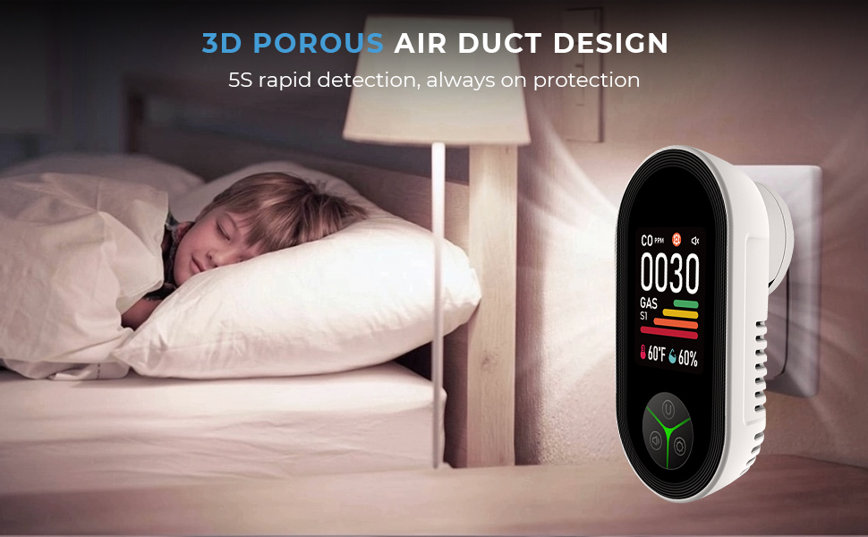 Kentfaith draagbare CO-monitor met geavanceerd 3D poreus luchtkanaal versnelt de luchtstroom voor snellere, 5-seconden detectie en grotere gevoeligheid. Elke ademhaling wordt krachtig gemonitord, waardoor u zeker wordt en de zekerheidstelling heeft dat uw dierbaren altijd veilig en beschermd zijn.
