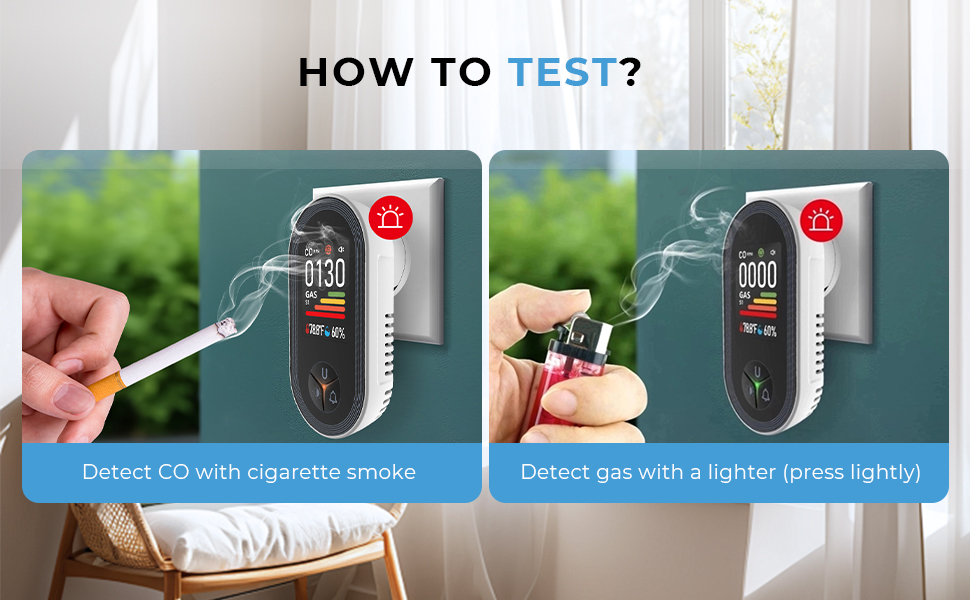- 1) Om de CO-detectie te testen, houd een brandende sigaret dicht bij de ventilatierooster.