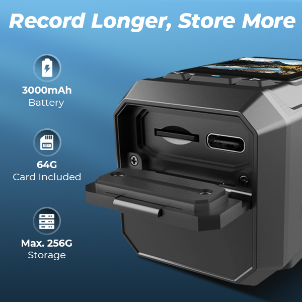 Fiets de hele dag met vertrouwen. De fietscamera is uitgerust met een 3000mAh-batterij die 8 uur ononderbroken opnames mogelijk maakt, zodat je reizen van begin tot eind gedekt zijn. Met een inbegrepen 64 GB-kaart kun je meteen beginnen met opnemen. Meer ruimte nodig? Breid uit tot 256 GB en leg elke mijl, elk uitzicht en elk bewijs vast.