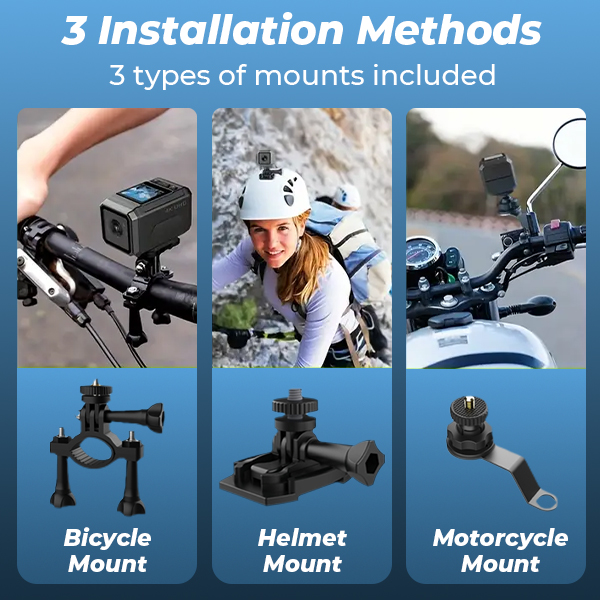 Met zijn universele 1/4" schroefdraad en 3 meegeleverde bevestigingen, past de Kentfaith fietscamera naadloos aan bij jouw rit—of het nu op een fietsstuur, motorfietsbuitenspiegel of helm is. Eén camera, drie manieren om te installeren—waardoor je de vrijheid hebt om elke rit vast te leggen.