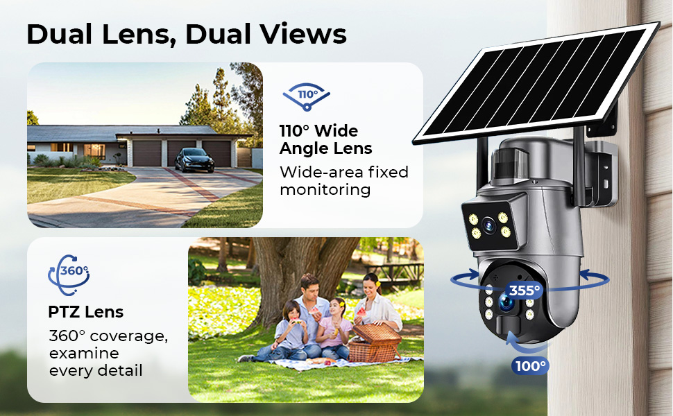 - * Dubbele Lenzen: De dual-lens camera elimineert blinde vlekken voor maximale bescherming. De 110° groothoeklens dekt belangrijke gebieden, terwijl de PTZ-lens 355° horizontaal roteert, 100° kantelt en 4x zoomt voor close-up detail. Perfect voor veranda’s, tuinen, boerderijen of vakantiehuisjes. Te bedienen via de meegeleverde UBox-app.