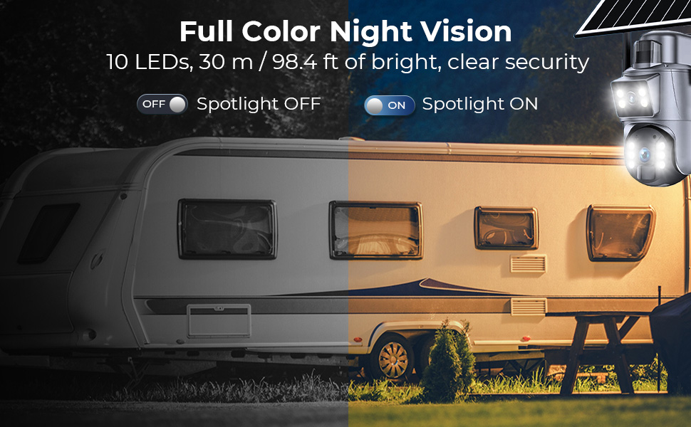 - Met een krachtige 10-LED witte spotlight biedt de Kentfaith cellulaire beveiligingscamera volledig kleurenzicht in het donker, met een bereik tot 30m/98,4ft. Daarnaast zorgt de ingebouwde IR-verlichting voor kristalheldere zichtbaarheid, zelfs in volledige duisternis—zodat u geen enkel detail mist, dag of nacht.