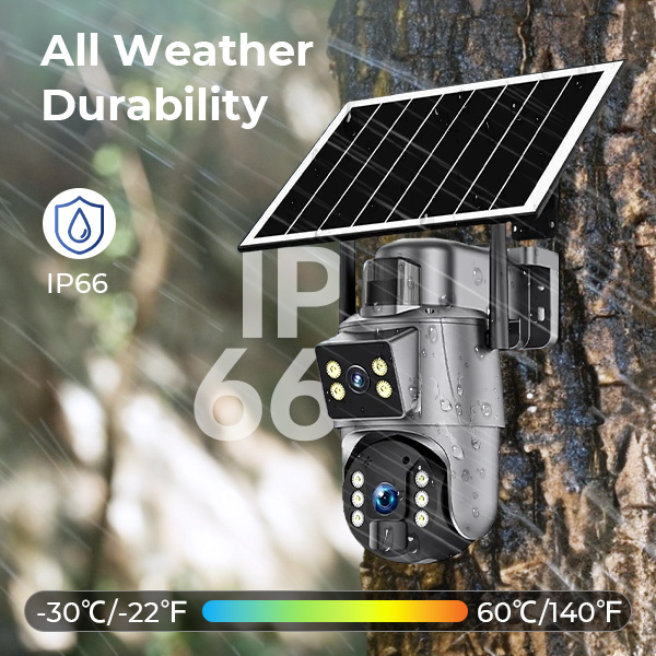 - Regen, sneeuw of wind – deze op zonne-energie werkende beveiligingscamera is gebouwd om alles aan te kunnen! Met een IP66 waterdichtheid en temperatuurbestendigheid van -20°C tot 50°C, is hij klaar om uw eigendom het hele jaar door te beschermen.