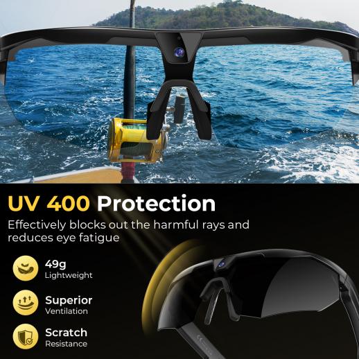 Bescherm uw zicht met hoogwaardige gepolariseerde lenzen die volledige UV400-bescherming bieden, 99% van de schadelijke UVA/UVB-stralen filteren om schittering te elimineren en oogvermoeidheid te verminderen voor een scherpere en comfortabelere reis.