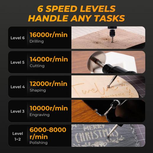 - * <b>6-Snelheidsinstellingen, Soepele Bediening voor Elke Taak</b>: De Kentfaith draadloze roterende toolset heeft 6 snelheidsaanpassingen (6000/8000/10000/12000/14000/16000 RPM), geschikt voor alles van zacht schuur tot hoogwaardig slijpen. Zelfs beginners kunnen veilig en soepel werken, met trapsgewijze snelheidsaanpassingen voor schonere en nauwkeurigere resultaten. Met de micro roterende tool zijn je creaties altijd binnen handbereik.