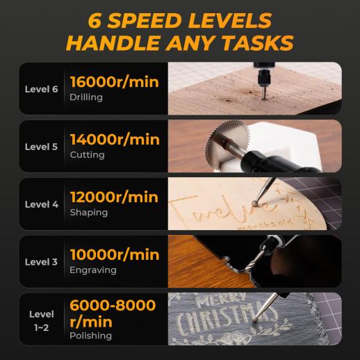 - * <b>6-Snelheidsinstellingen, Soepele Bediening voor Elke Taak</b>: De Kentfaith draadloze roterende toolset heeft 6 snelheidsaanpassingen (6000/8000/10000/12000/14000/16000 RPM), geschikt voor alles van zacht schuur tot hoogwaardig slijpen. Zelfs beginners kunnen veilig en soepel werken, met trapsgewijze snelheidsaanpassingen voor schonere, nauwkeurigere resultaten. Met de micro roterende tool zijn je creaties altijd binnen handbereik.