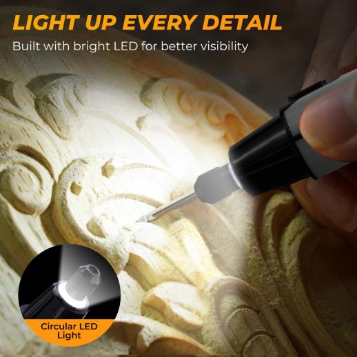 Een enkele LED verlicht slechts een kleine plek – maar onze roterende tool gebruikt een volledige ring van LED's rond de punt, waardoor het verlichte gebied krachtig wordt vergroot. U ziet elke textuur, groef en detail van uw werk met onzichtbare helderheid.