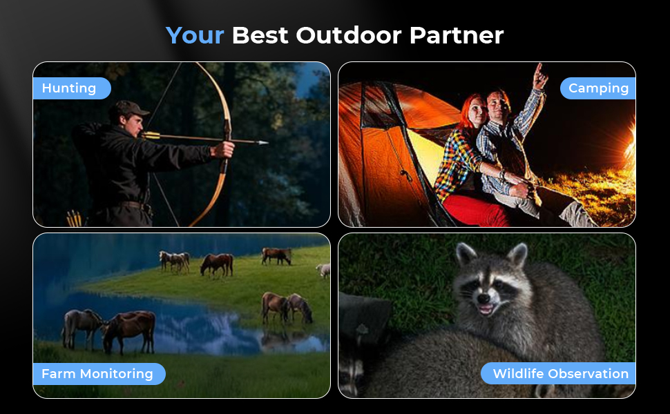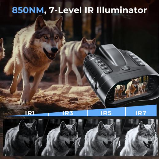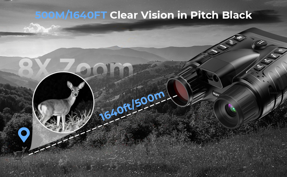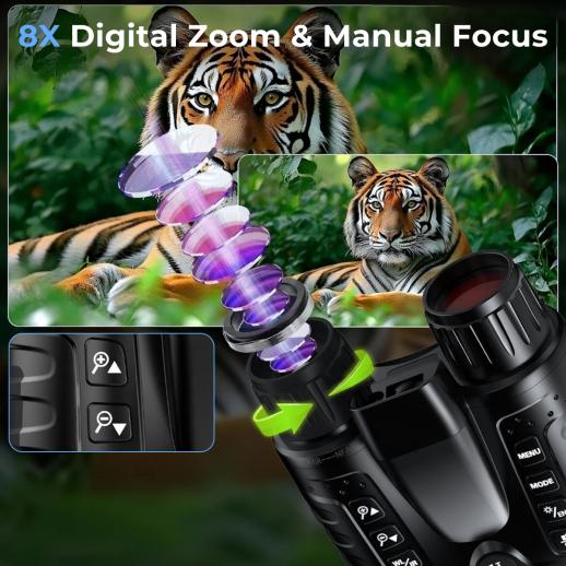Met een nachtzichtbereik van 500m/1640ft en 8× digitale zoom, laten de nachtkijkers je verre onderwerpen volgen en scherp in beeld brengen in het donker. Ideaal voor nachtobservatie op lange afstand, het bekijken van wildlife en beveiligingsmonitoring—heldere beelden, altijd.