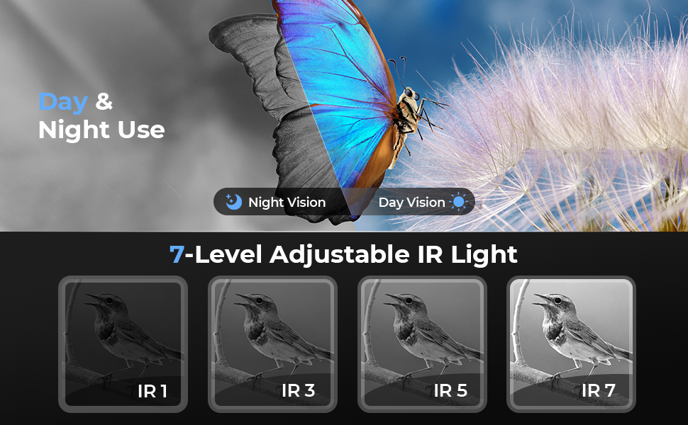 - * Ver in het Donker: Een krachtige 3W 850nm infraroodverlichter biedt een duidelijk zicht tot 500 meter in volledige duisternis. Met 7 instelbare IR-niveaus kunt u de helderheid optimaliseren voor verschillende afstanden en omstandigheden—ideaal voor het volgen van wildlife en nachtelijke beveiliging.