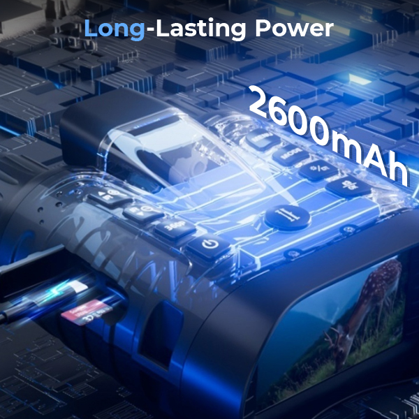 Uitgerust met een oplaadbare batterij van 2600mAh en een USB-C oplaadpoort, bieden deze IR-nachtkijkers een langere gebruiksduur en sneller opladen. Het bevat een 32GB geheugenkaart en ondersteunt tot 256GB, wat voldoende opslag biedt voor langere opnames en fotosessies.