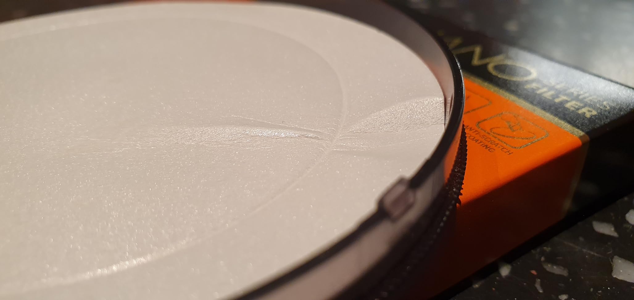 Helaas lijkt de voering in de behuizing te zijn gevouwen en gekreukt tijdens het verpakken in de fabriek, dus het risico bestaat dat het glas wordt aangeraakt. Deze behuizing is teleurstellend vergeleken met de behuizing die werd geleverd met hun variabele ND32-ND512-filter. Deze behuizing laat het filter los en rammelend achter, tenzij het schuimvel aanwezig is, maar het filter zit op rubbers, wat betekent dat het niet concentrisch kan zitten en het schuimvel geleidelijk zal afbreken, zelfs als het niet bij de fabrikant is verknoeid. Het zou niet zo moeilijk moeten zijn om een ​​behuizing te maken die gewoon werkt... Dit filter wordt bewaard in een Hoya-kuip