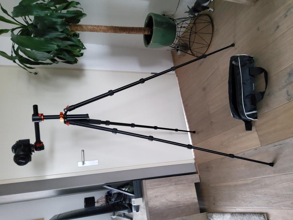 Het driepootstatief kan worden uitgeschoven tot ongeveer 1,54 meter. Onderaan zit een haak waarmee extra gewicht kan worden bevestigd voor meer stabiliteit. Omdat ik het statief niet altijd volledig uitschuif, was extra gewicht voor mij niet nodig.
