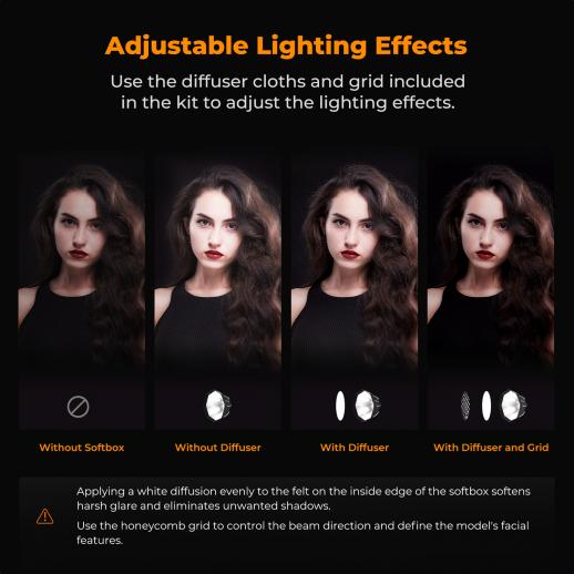 - * Hoogwaardige materialen: Gemaakt van premium nylonstof met hoogreflecterende coating voor een zachte, gelijkmatige lichtverspreiding. De meegeleverde diffuser met hoge lichttransmissie zorgt voor extra gelijkmatige verlichting. De hittebestendige PVC-houder voorkomt vervorming en verlengt de levensduur.