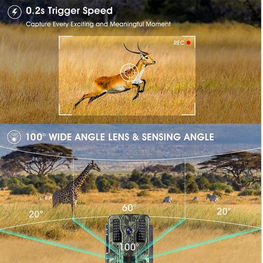 - * 100° groothoeklens en 46 IR-leds: De PIR-sensor met 90° detectiehoek en 46 onzichtbare infrarood-leds zorgt voor een breed zichtveld zonder dieren te verstoren. Zelfs bij regen worden bewegingen helder vastgelegd.