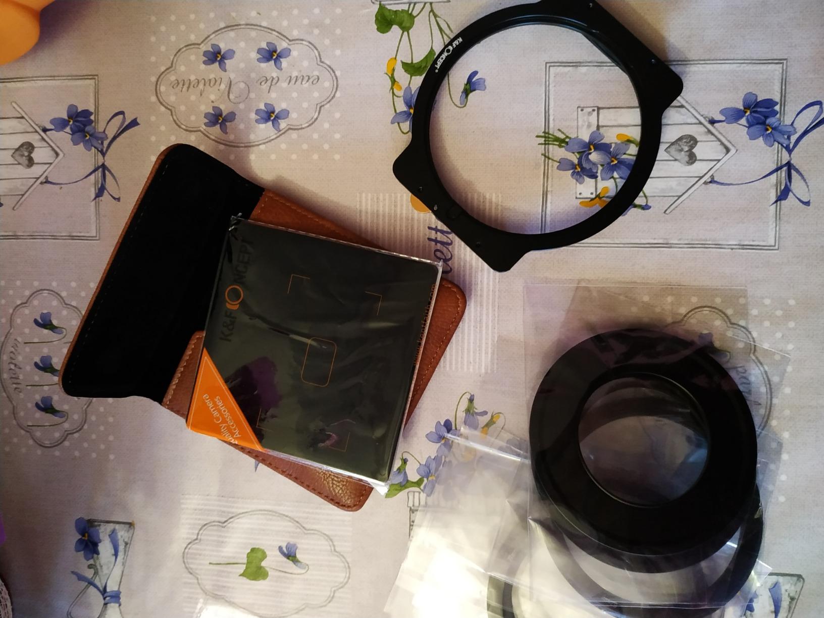 Ik profiteerde van een korting van ongeveer 50% toen ik het wilde bestellen. De levering vond de volgende dag plaats. Perfect verpakt, ik was aangenaam verrast door de zorg die de fabrikant besteedde. Het is op zichzelf goed beschermd lederen tasje om het te dragen. Een belangrijk detail is dat er een lipje is om hem eruit te halen, waardoor je er niet met je vingers op hoeft te zitten. De filterhouder ziet er goed uit met zijn vergrendeling op de adapterring. Er zijn verschillende stalen ringen die solide lijken