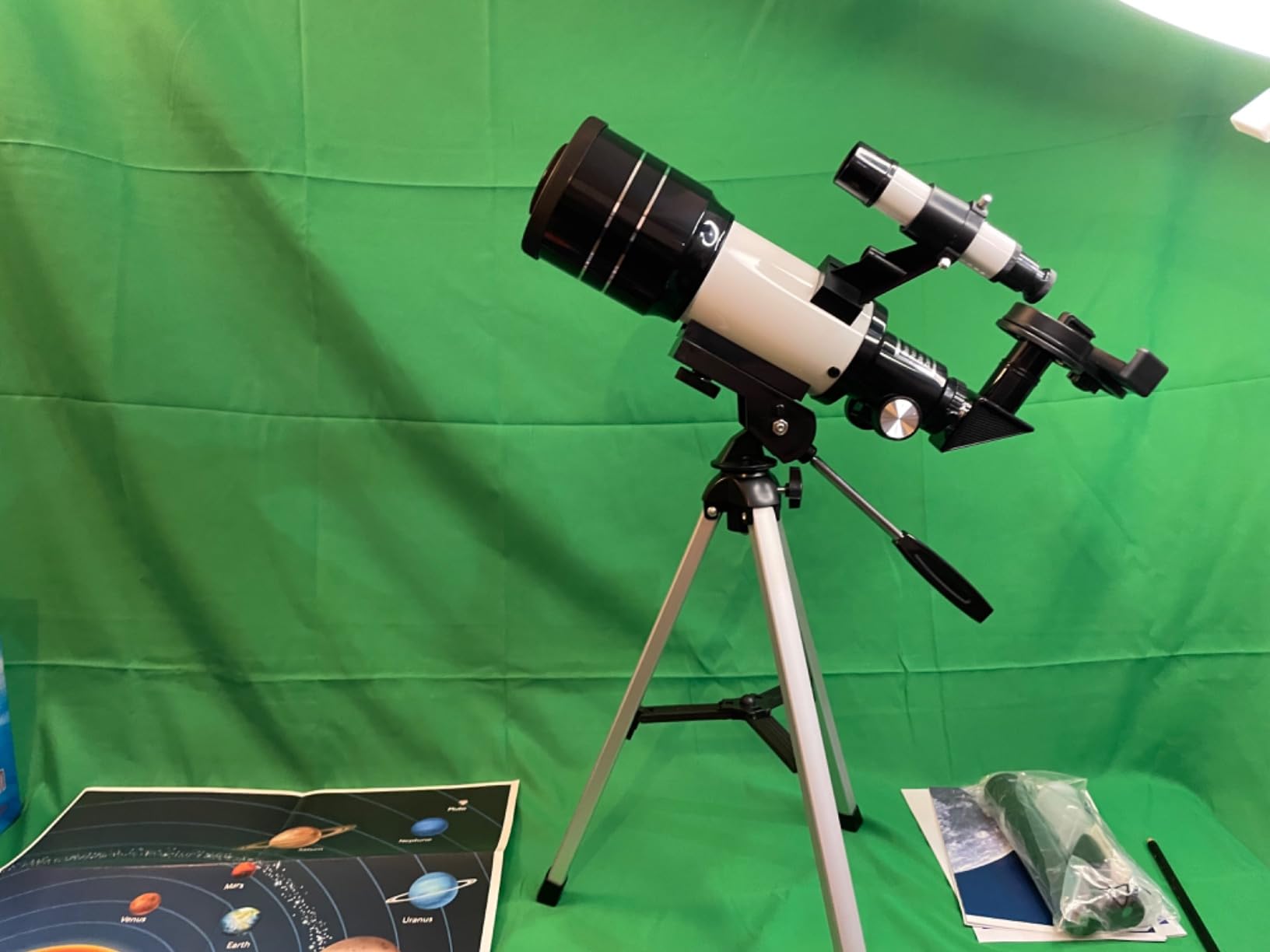 Deze tafeltelescoop is een fantastische koop voor iedereen die de nachthemel wil verkennen of eenvoudig prachtige natuurfoto's wil maken! Uitgerust met zowel 6mm als 20mm lenzen, biedt het heldere, gedetailleerde beelden, of u nu naar planeten of landschappen kijkt. Een van de coolste functies is de mogelijkheid om uw telefoon aan te sluiten om vast te leggen wat u door de lens ziet, rechtstreeks op uw camera - geen extra apparatuur nodig! De meegeleverde afstandsbediening is een game-changer voor het maken van foto's zonder de opstelling te verstoren, zodat uw opnamen scherp en stabiel zijn. Hoewel het bevestigingsaccessoire voor de telefoon wat strakker moet worden aangedraaid om vast te zetten, worstelde ik even, maar ik ontdekte dat ik deze praktische aanpak eigenlijk verkies voor meer controle, in plaats van een "instellen en vergeten"-systeem. Het geeft u de flexibiliteit om indien nodig aan te passen voor de perfecte foto. Het meegeleverde statief is stevig en, zoals afgebeeld, een kortere lengte die perfect is voor gebruik op tafel. Deze opstelling maakt het gemakkelijk om binnen of buiten te gebruiken, zonder dat er een enorme opstelling nodig is. Al met al biedt deze telescoop een uitstekende prijs-kwaliteitverhouding, waardoor u de schoonheid van wat u door de lens ziet met gemak kunt vastleggen. Perfect voor beginners of hobbyisten, het is een geweldige aanvulling op de collectie van elke sterrenkijker! Ook werden als bonus 2 16x16 posters, een van de maan en een van de ruimte, meegeleverd!