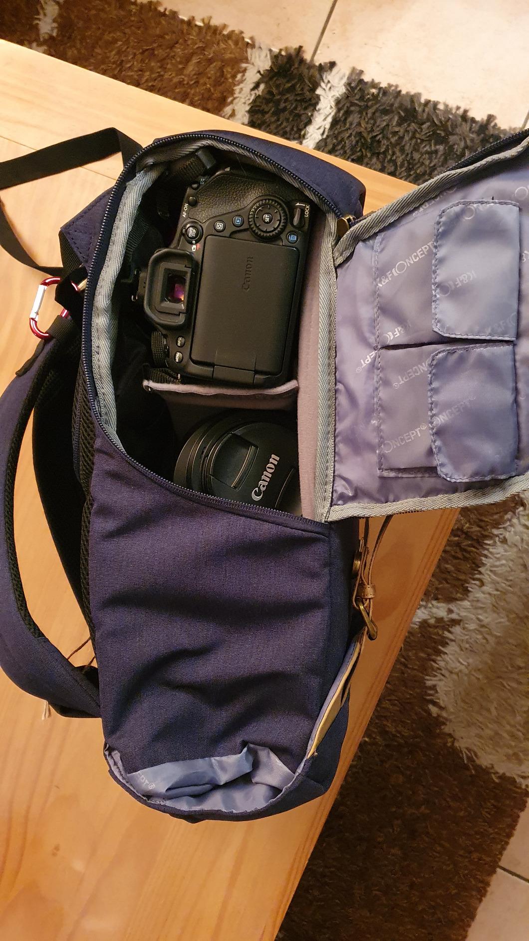 Ik werd in eerste instantie aangetrokken door de tas zelf die ik erg mooi vond, ik kan op dit punt net zo goed eerlijk zijn. Verder heb ik maar één lens bij mijn camera, waardoor ik hem in een vakje aan de onderkant kan stoppen (zie foto). De rest is dus gratis, en perfect voor een fotowandeling: ik zet er mijn fles water en een kleine picknick neer. De waterdichte tas om mee te nemen als het regent.