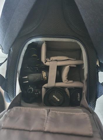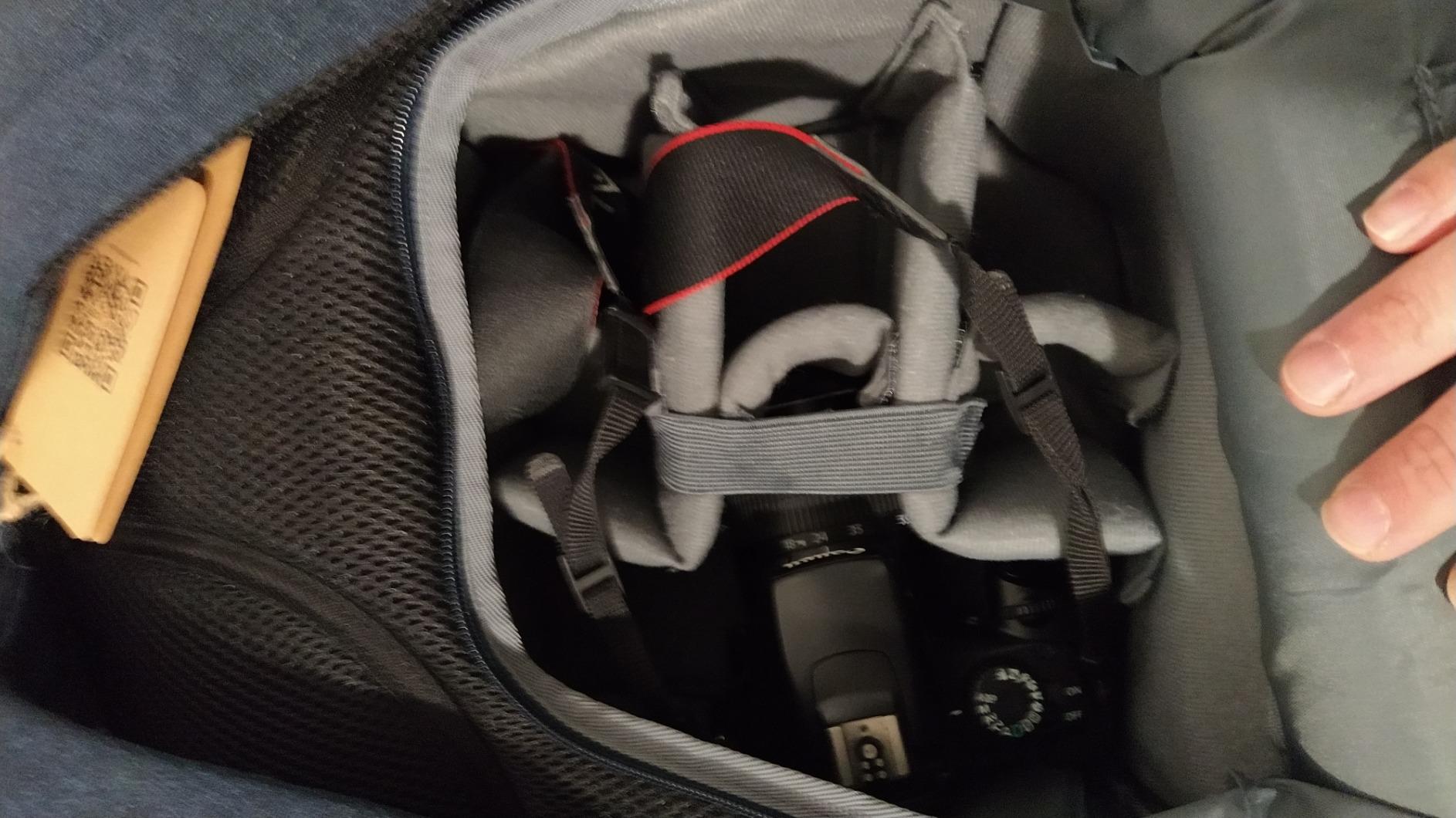 Mijn 5D vindt zonder problemen zijn plaats in deze tas met zijn 18-80 mm. Ook is er ruimte voor andere accessoires zoals acculaders en andere lenzen. De schuimcompartimenten kunnen aan elk apparaat worden aangepast. Praktisch om uw toestel op uw rug te dragen, terwijl u goed beschermd bent. De opening aan de achterkant beschermt het toestel bovendien tegen pogingen tot diefstal.