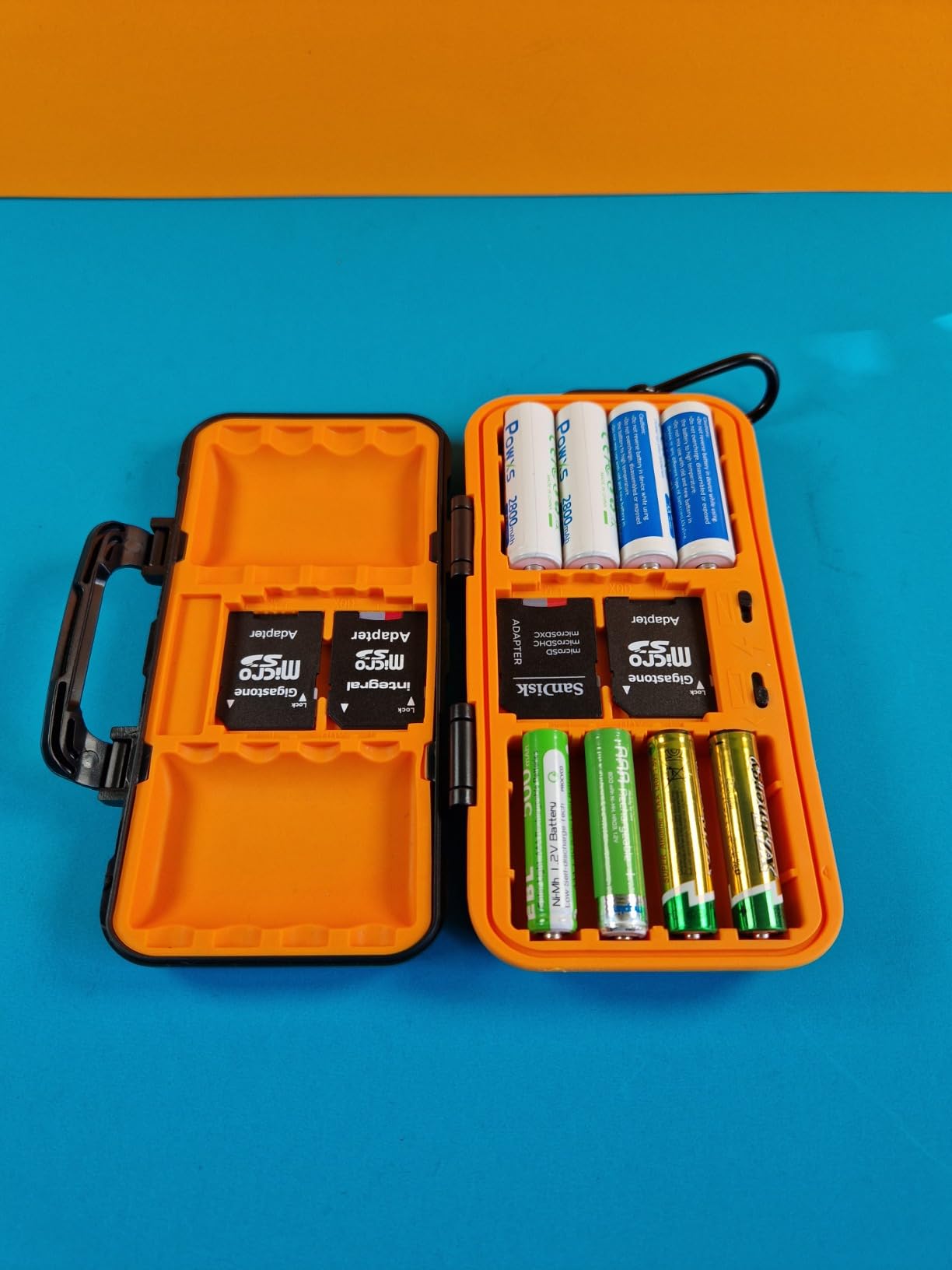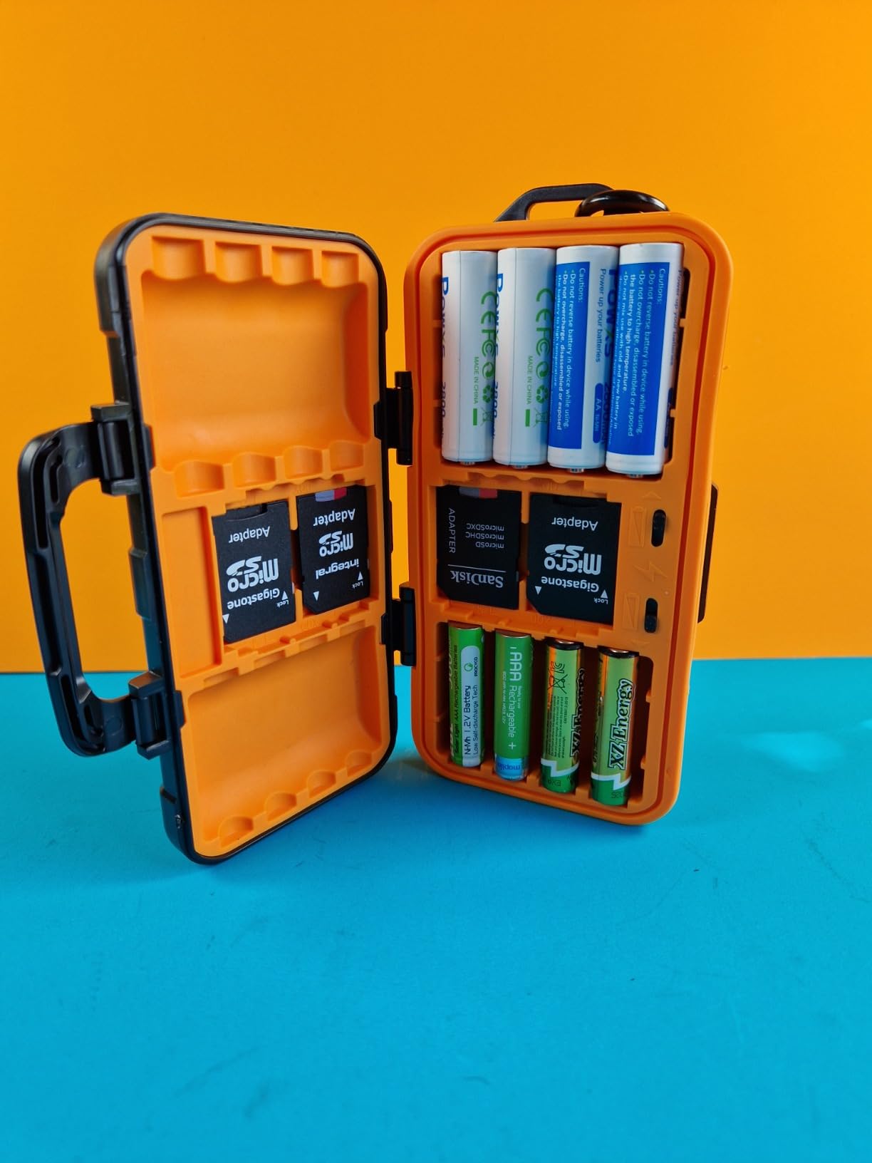 K&F Concept 16 slots geheugenkaart en camerabatterijhouder, waterbestendige SD CF TF-batterijhouder voor 2 camerabatterijen, 8 AAA-batterijen, 2 CF/XQD, 4 SD-kaarten en 6 kaarten TFA goede solide multifunctionele batterij en TF-kaarthouder Goede constructiekwaliteit. Geschikt voor 4 AAA-batterijen en 4 AA-batterijen 4 SD-KAARTEN en 4 micro SD-kaarten. 2 batterijen voor spiegelreflexcamera. Goede afdichting in gesloten toestand. Zeer duurzame en duurzame behuizing 5 sterren