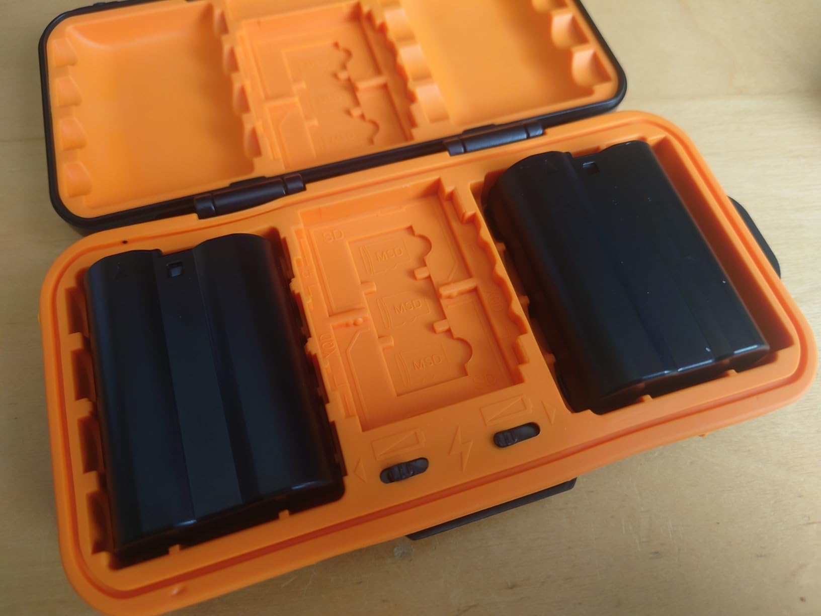 Een stevig hoesje dat (voor mij) ideaal is. De buitenkant van de behuizing is gemaakt van duurzaam plastic en aan het uiteinde hangt een label. Ze bieden een kleine karabijnhaak om erin te komen, zodat je hem indien nodig aan een tas kunt bevestigen. Het oranje inzetstuk is gemaakt van stevig siliconen en hecht goed aan de inhoud. Er is ruimte voor twee batterijen van spiegelreflexformaat (mijn Nikons passen er perfect in) of vier AA- en vier AAA-batterijen. Het AAA-batterijcompartiment is iets smaller om ze beter vast te houden, maar is waarschijnlijk minder handig omdat ik niet zeker weet hoeveel apparaten ze tegenwoordig gebruiken. Ik ben blij met hun formaat, omdat ik twee camerabatterijen kan hebben, of één camerabatterij en een set AA's voor mijn flitser. Er zijn 4 SD-kaarten nodig, wat waarschijnlijk voldoende is gezien de mogelijkheden die je kunt krijgen, maar als je camera twee slots heeft, zijn er enkele veranderingen. De Micro SD-kaartsleuven zijn ook ideaal voor actiecamera's, zelfs als er geen batterij voor is. Ideaal voor mij, om reservebatterijen en kaarten op één plek te bewaren. Het heeft kleine schuifregelaars om aan te geven of de batterijen aan beide kanten zijn opgeladen of niet. Normaal gesproken heb ik een pijl waarop ik teken en verander de richting van de batterij, maar dit is een goed alternatief. Robuust, waterdicht en goed gemaakt. Het is ook geen slechte prijs.