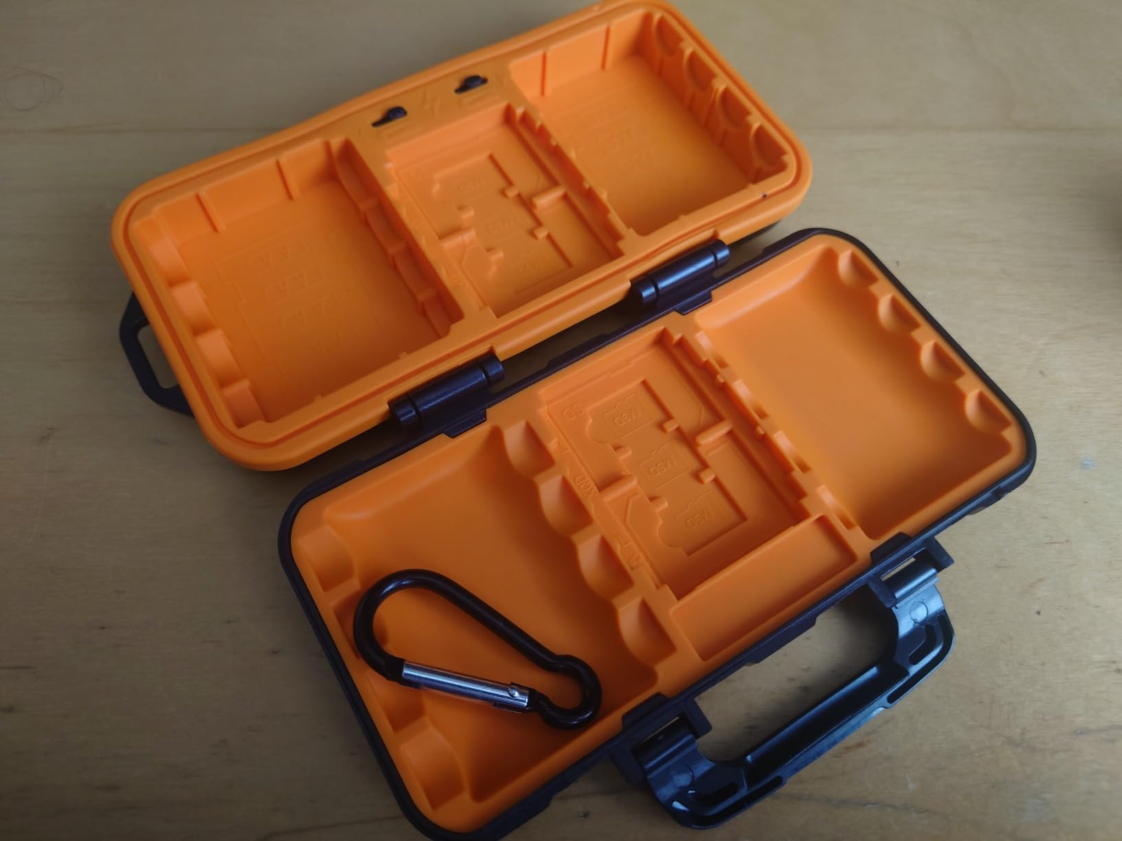 Dit kleine ding is een stevige geheugenkaarthouder die ik heb getest met een aantal SD-kaarten - deze passen precies, maar niet zo strak dat ik me zorgen zou maken als ze kapot zouden gaan! Ik voel het en vergelijk het met andere soortgelijke producten die ik bezit, de buitenkant is gemaakt van zeer duurzaam plastic en de binnenkant heeft rubberen sleuven om de kaarten tegen beschadiging te beschermen, wat betekent dat de afdichting een goede waterbestendigheid biedt - vooral in combinatie met de plastic sluiting die stevig vastzit. Het goede hieraan is dat de tas een handige karabijnhaak bevat waarmee je hem aan tassen/holsters/riemen enz. kunt bevestigen. maar ik ontdekte dat hij mooi in het kleinste zakje van mijn rugzak past!