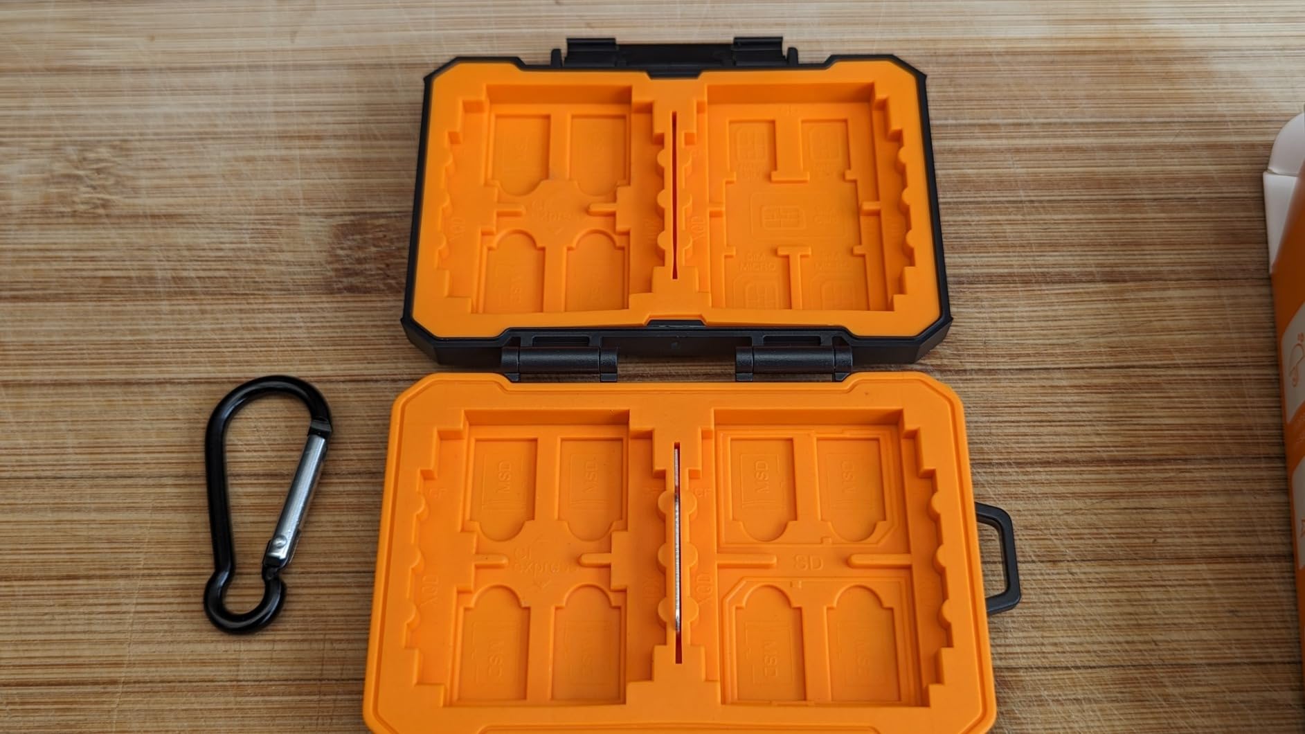 Dit is een goede, slimme, nette kleine opbergdoos voor kaarten, met een stevige, harde plastic buitenschaal; Siliconen randstrip om weerstand te bieden tegen het binnendringen van water en netjes gestapelde siliconen kaarthouders. De kaartvakken zijn goed gevormd en passen precies en de siliconen zijn bestand tegen stoten en schokken. Er zijn slots voor nano-, micro- en klassieke simkaarten; standaard micro- en SD-kaarten, en meer. Een bijgeleverd hulpmiddel voor het uitwerpen van de simkaart wordt in een sleuf tussen de twee zijden van de behuizing gestoken. Deze kan worden bevestigd aan riemen, bagage etc. door middel van een afneembare karabijnhaak. Het geheel is lekker compact - ongeveer zo groot als een creditcardhouder.