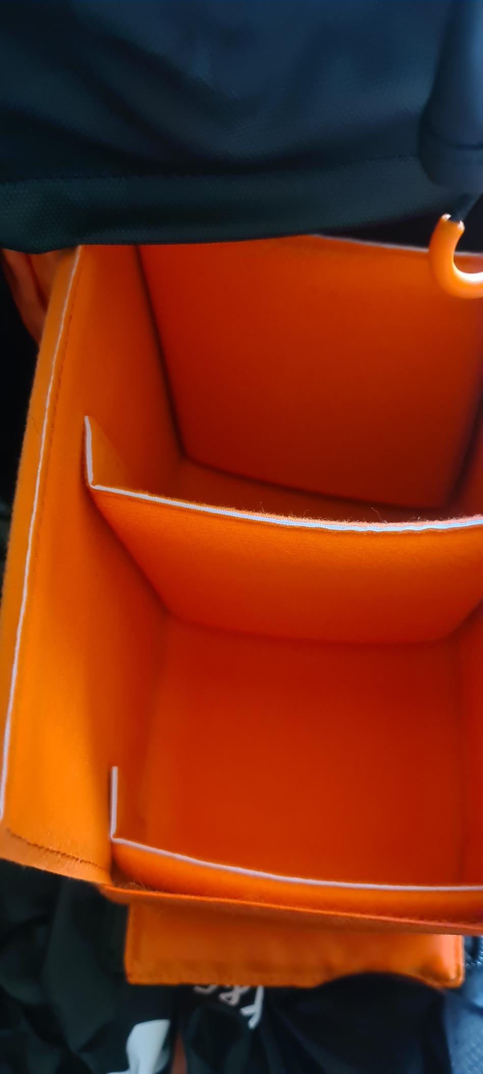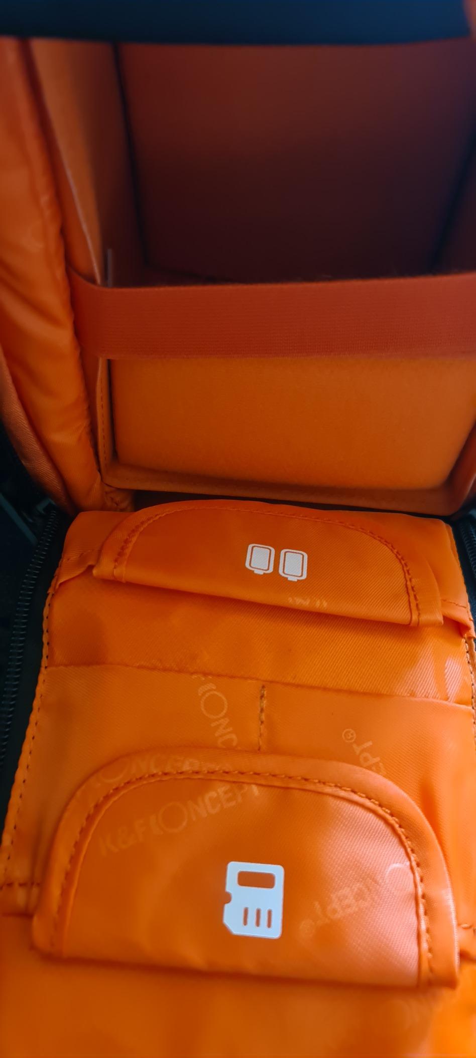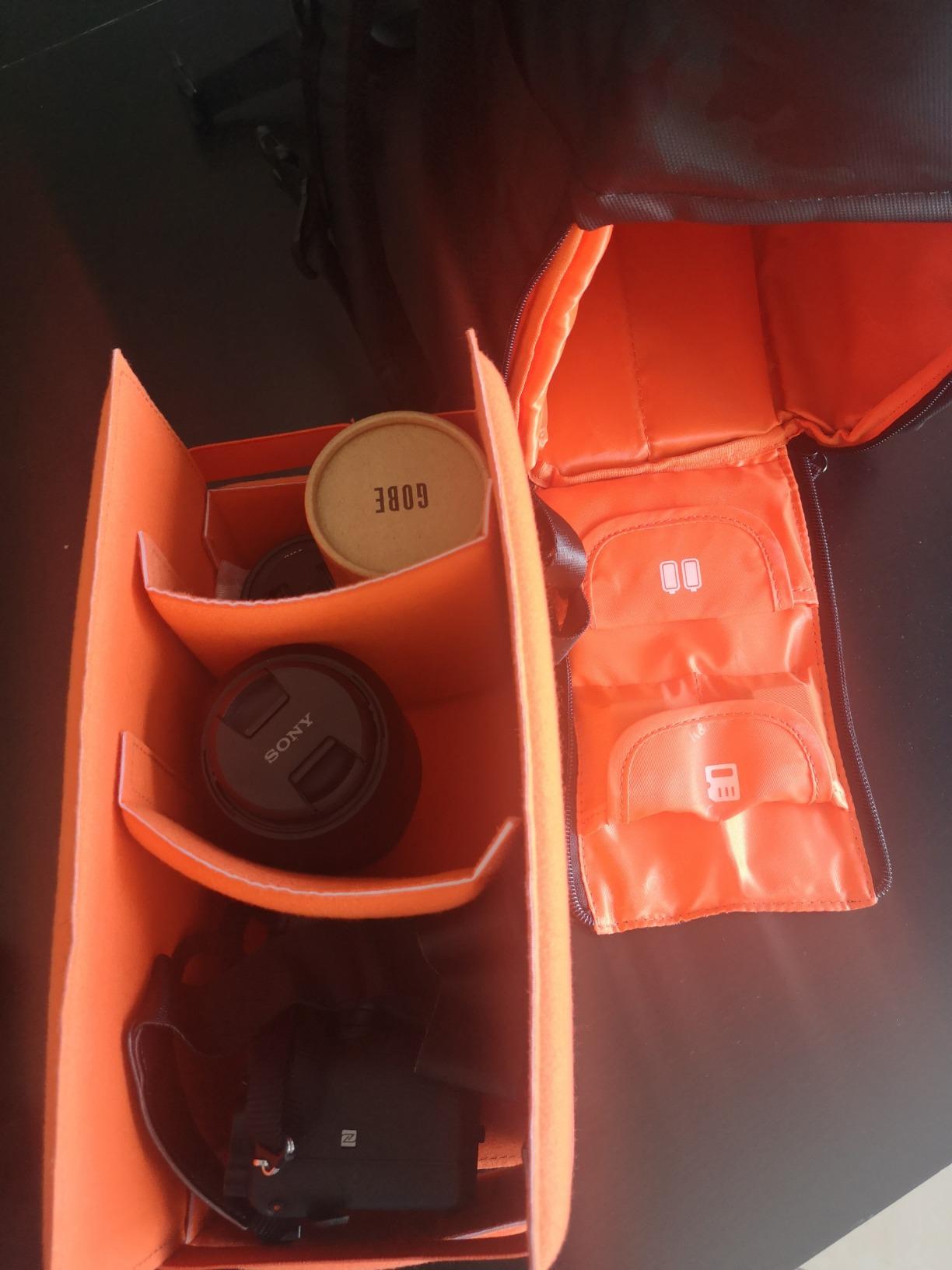 In het cameracompartiment is voldoende ruimte voor een DSLR en twee lenzen. Maar er is ook voldoende ruimte voor andere accessoires in de rugzak. In de klep zitten nog vakjes voor 2 geheugenkaarten en twee batterijen. (Er past 2 x LPE-6 in). Binnenin is alles oranje, dus ook bij weinig licht vind je alles snel terug.