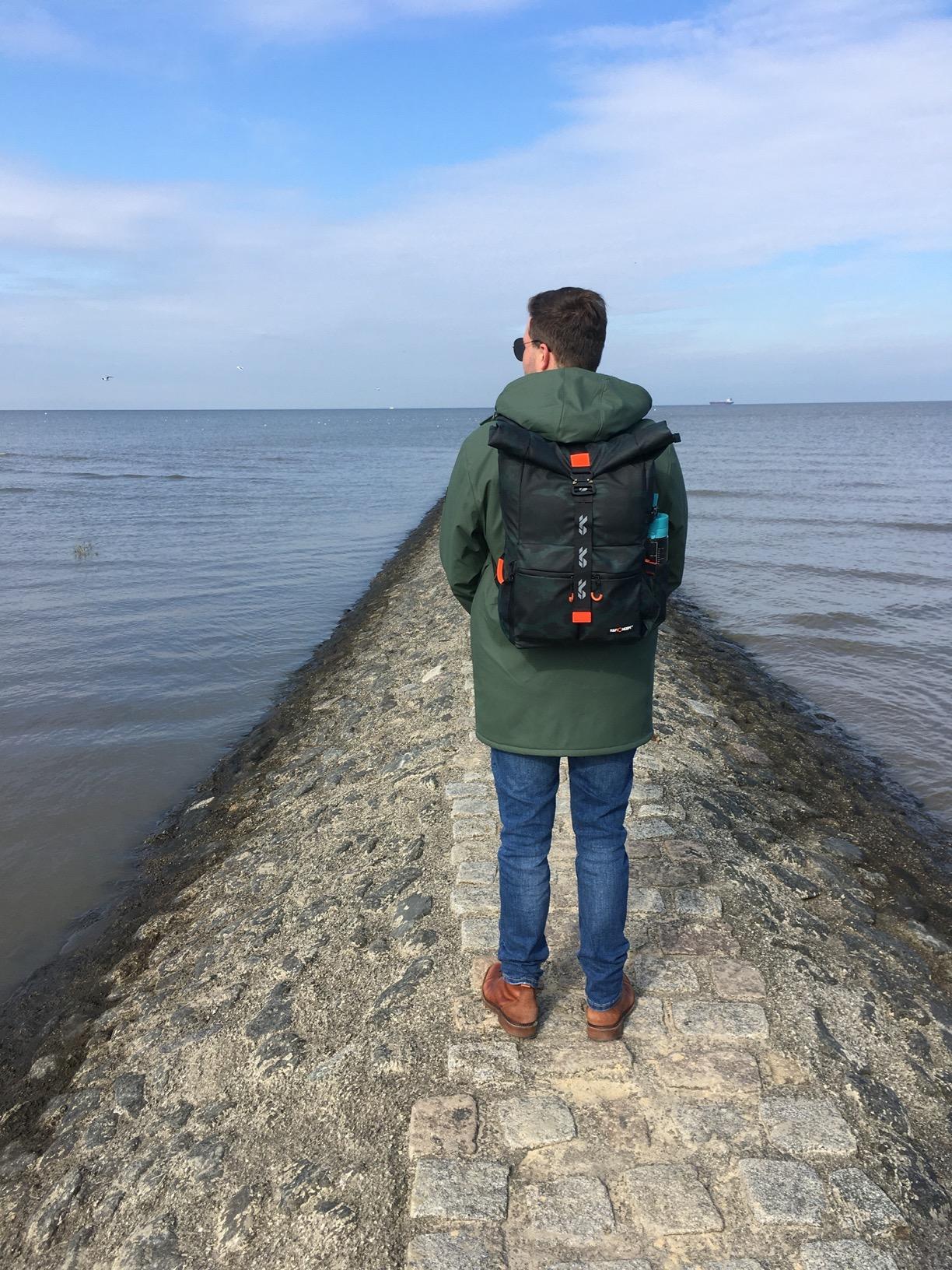 De rugzak werd voor een eerste test naar Helgoland gebracht. Ik vind het vooral belangrijk dat je aanvullende dingen over de camera weet. Deze rugzak biedt echt voldoende ruimte voor een trui, jas en andere spullen en om te winkelen. Door het bovenste compartiment te laten oprollen, is de rugzak nooit te groot en past hij perfect. Ik vind het leuk dat er een groot vak aan de zijkant is, alleen voor de waterfles. Je hoeft dus nooit bang te zijn dat als er iets lekt, de camera in gevaar is.