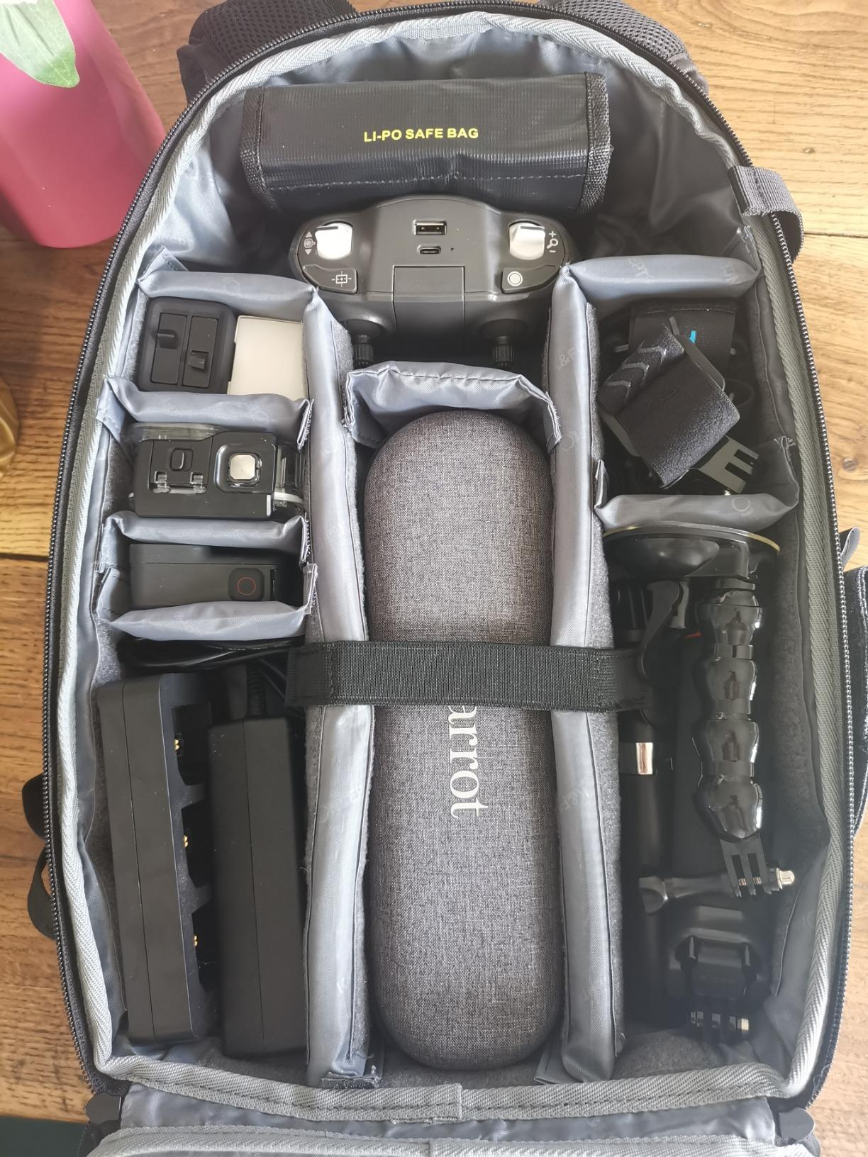 Ik gebruik deze tas om op reis te gaan met mijn Parrot Anafi-drone en mijn Gopro Hero 8 zwarte camera, alles wat erin zit is perfect, zelfs de palen die ik aanbeveel