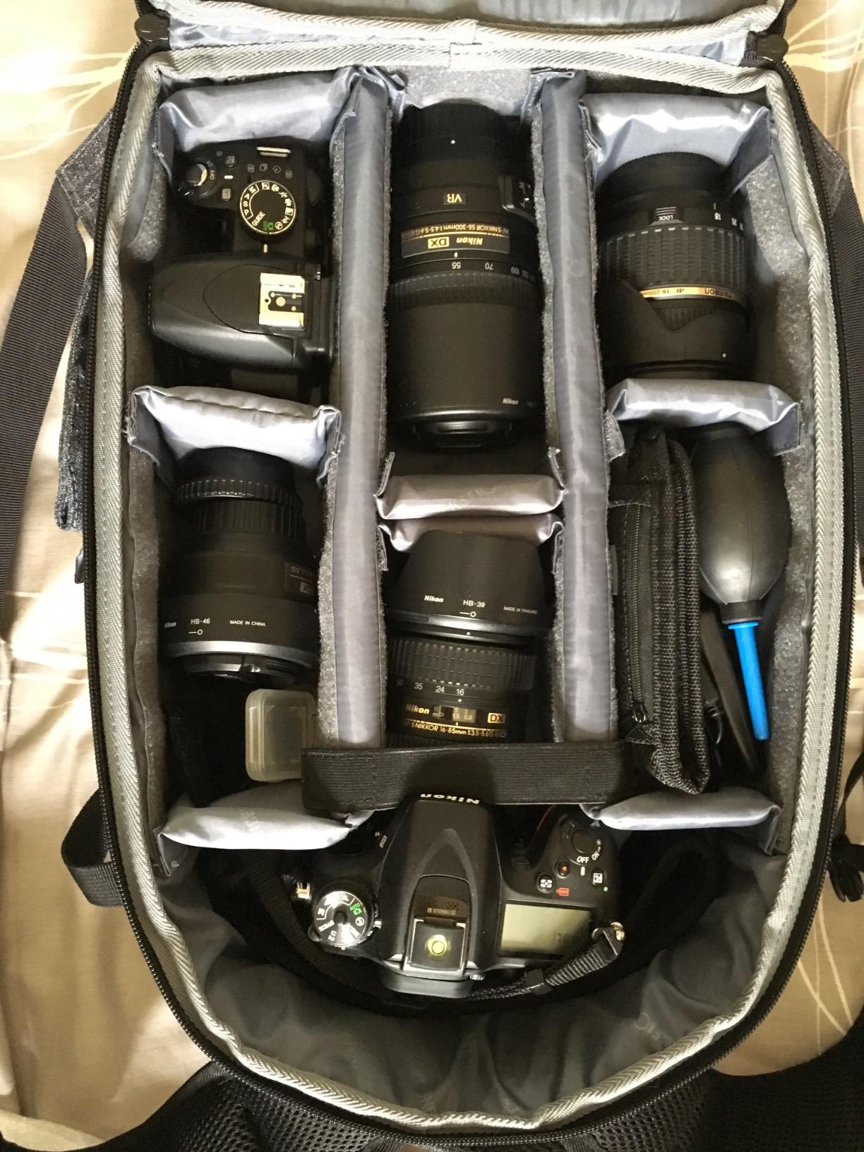 Uitstekende tas. Voldoet aan de aankondiging. Het deel dat in contact komt met de rug is dik, comfortabel en ademend. De riemen ook, goede vulling. Mogelijkheid om het fotogedeelte te rangschikken dankzij de klittenbanden. Voldoende ruimte voor een camerabody, drie of vier lenzen (afhankelijk van de grootte), een afstandsbediening, meerdere batterijen, meerdere filters, een oplader, enkele accessoires aan de zijkant, zeer praktisch. Talrijke opbergvakken Kortom: een stevige, compacte, comfortabele tas.