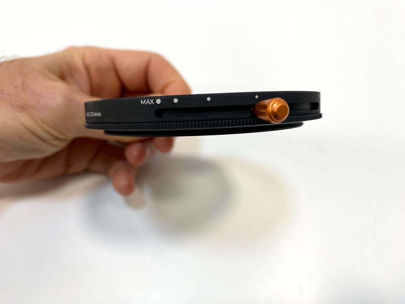 Geweldig voor videowerk, het ND-filter schuift soepel en stil van donker naar licht. Ik wou wel dat de ND-nummers op de filters stonden in plaats van stippen, maar verder is het echt geweldig.