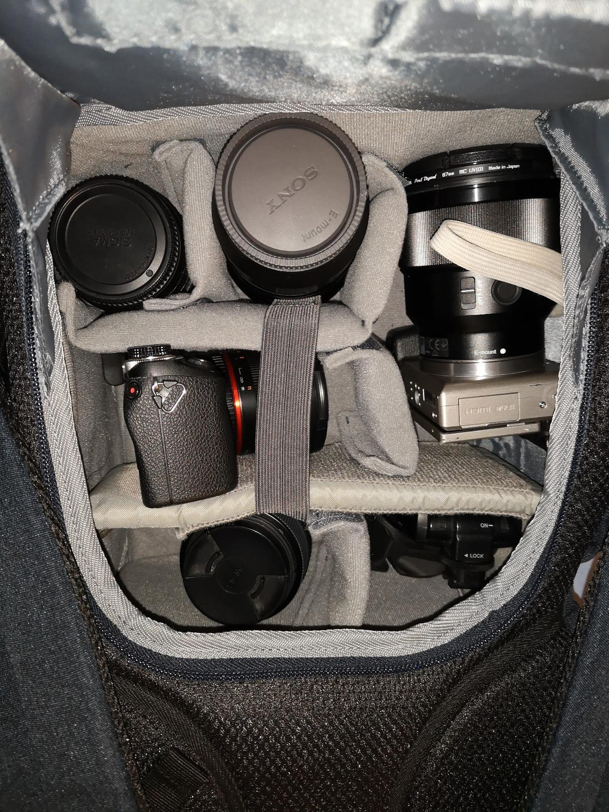 Het staat allemaal in de titel... Zeer praktisch en zeer comfortabel. Ik slaagde erin om mijn hybride met 2 lenzen en mijn drone met alle accessoires zonder problemen te plaatsen.