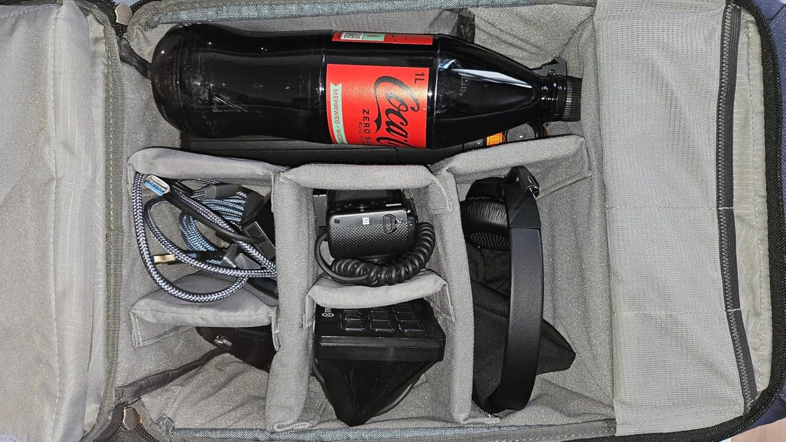 Het laptopvak is goed bereikbaar, en in het hoofdvak past een 1L fles Cola prima, die je gemakkelijk kunt pakken via het snelle toegangsvak. Er is nog genoeg ruimte om met de vakindeling een vak voor je headset te maken, een apart vak voor alle adapters, zoals een USB-HDMI-capturekaart, een USB-hub, een USB-verlengkabel en een HDMI-kabel. Daarnaast is er ook plek voor een aparte vak voor de muis en zelfs nog ruimte voor een simpele Sony-camera als webcam en een Streamdeck. Het bovenste vak is ruim genoeg voor een lunchbox en allerlei laders en adapters die je nodig zou kunnen hebben.