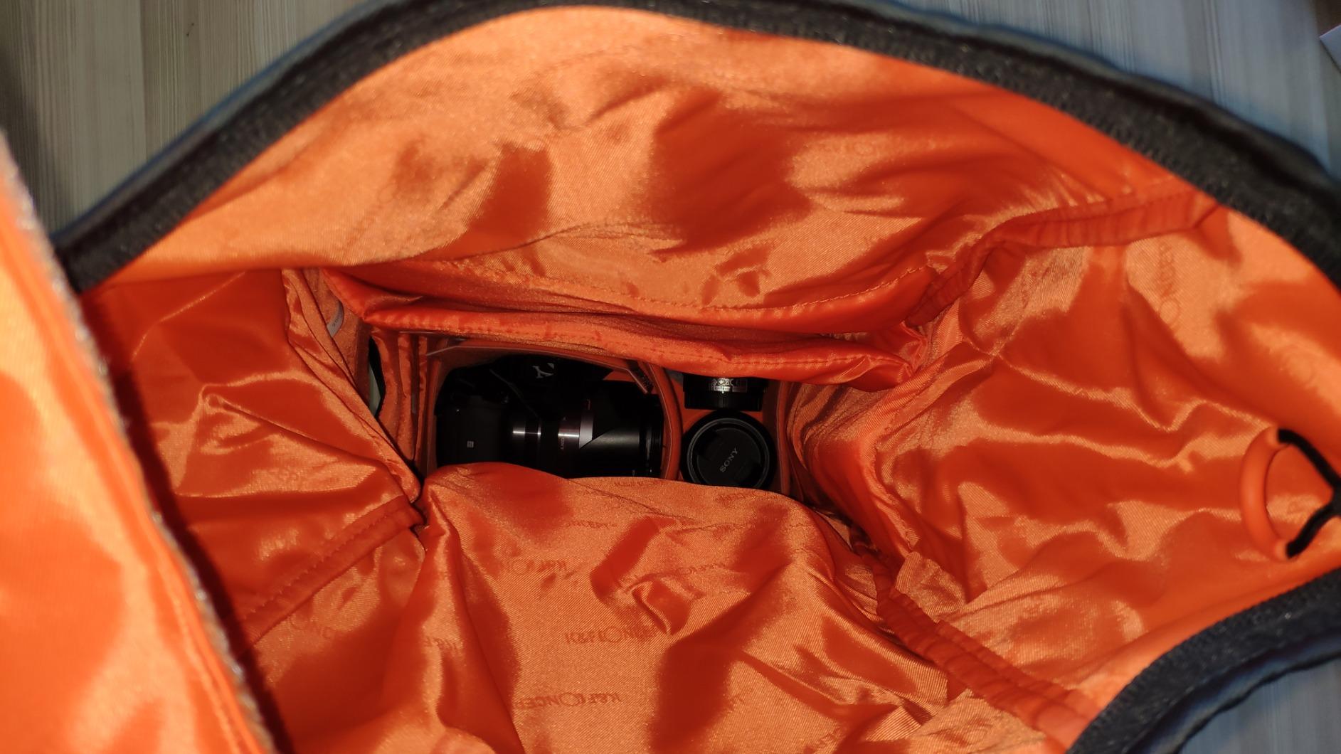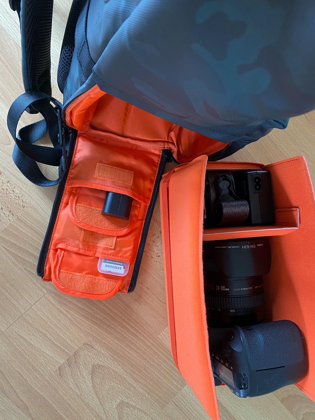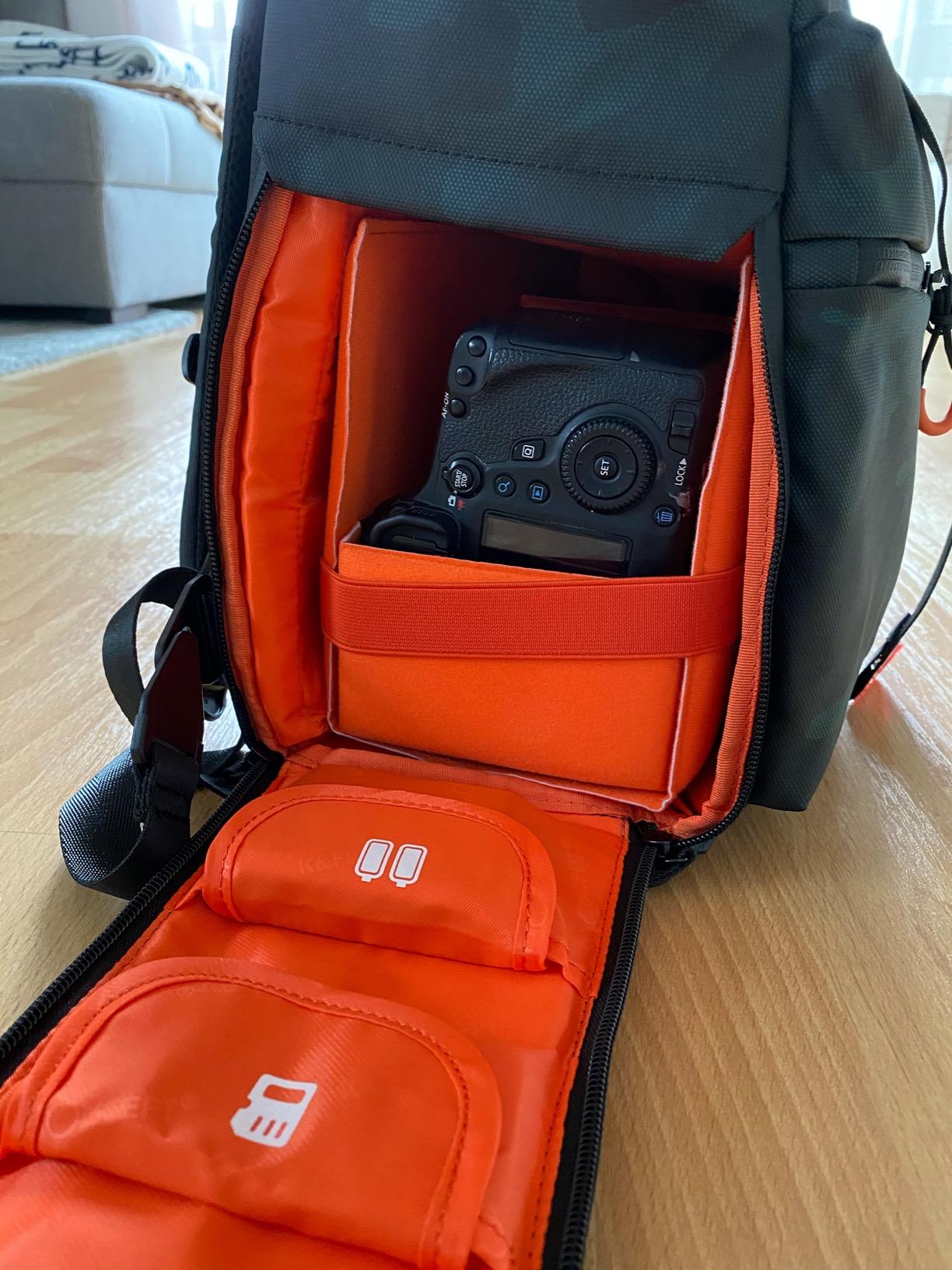 In het cameravak past makkelijk een DSLR met twee lenzen. Verder is er ook ruimte voor accessoires. In het klepje zitten vakjes voor twee SD-kaartjes en twee accu’s (LPE-6 passen erin). De binnenkant is oranje, zodat je ook bij weinig licht alles snel terugvindt.