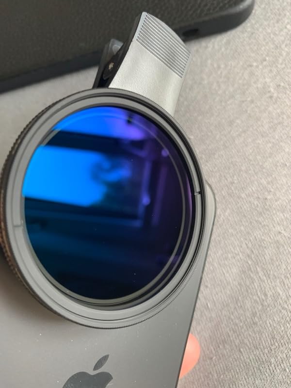 Verduisterend filter met een clip om hem aan de iPhone te bevestigen (werkt op alle modellen). Het filter kan worden losgeschroefd, heeft een 52 mm schroefdraad en kan ook op sommige Canon-camera's worden geplaatst. Handig bij direct zonlicht, anders kan de iPhone de helderheid automatisch aanpassen. Ik vind het effect erg mooi wanneer het licht door de lens heen schijnt en er blauwpaarse randen ontstaan. Als je ook een spiegelreflexcamera hebt, is dit een goede en voordelige aankoop.