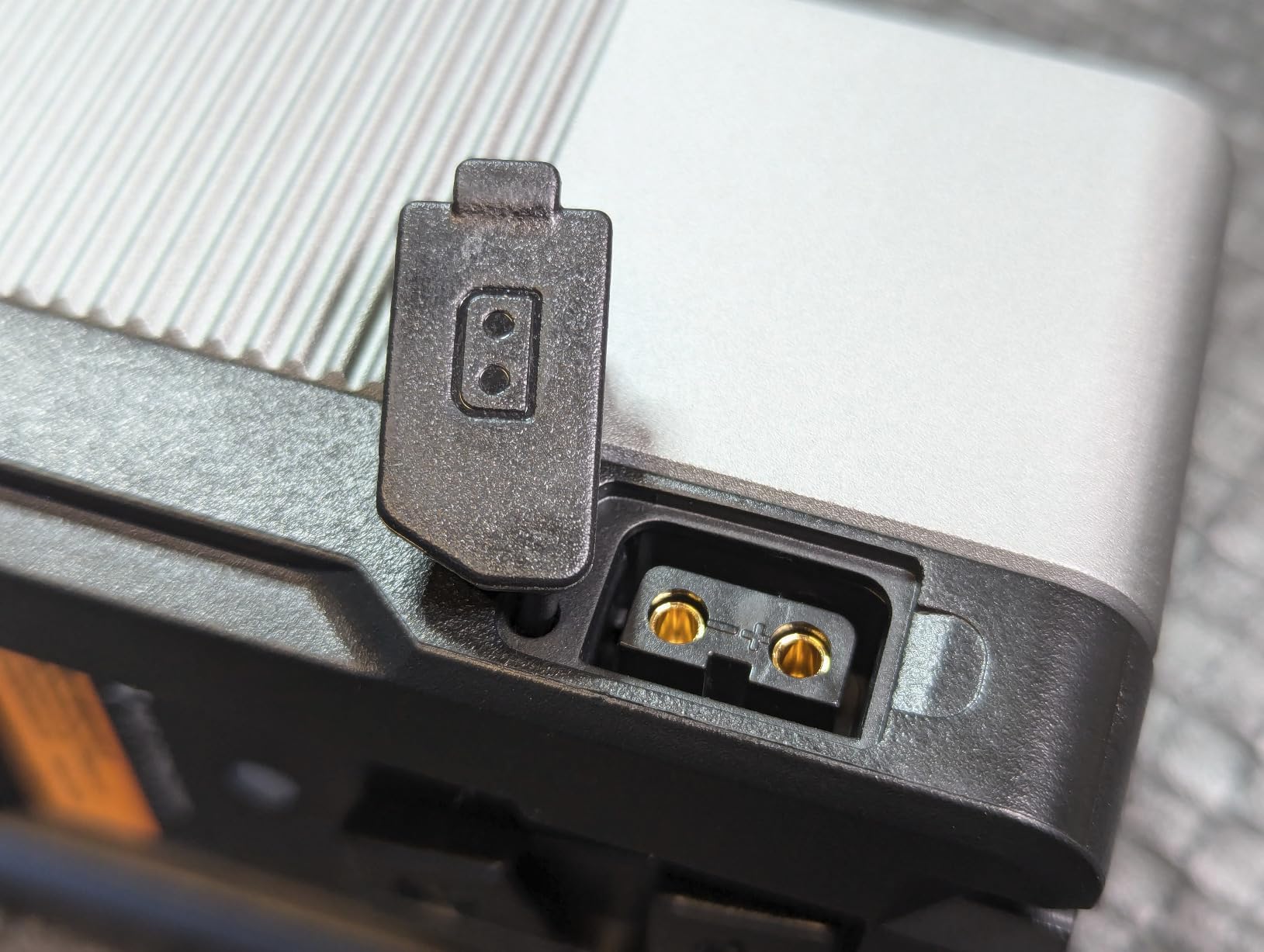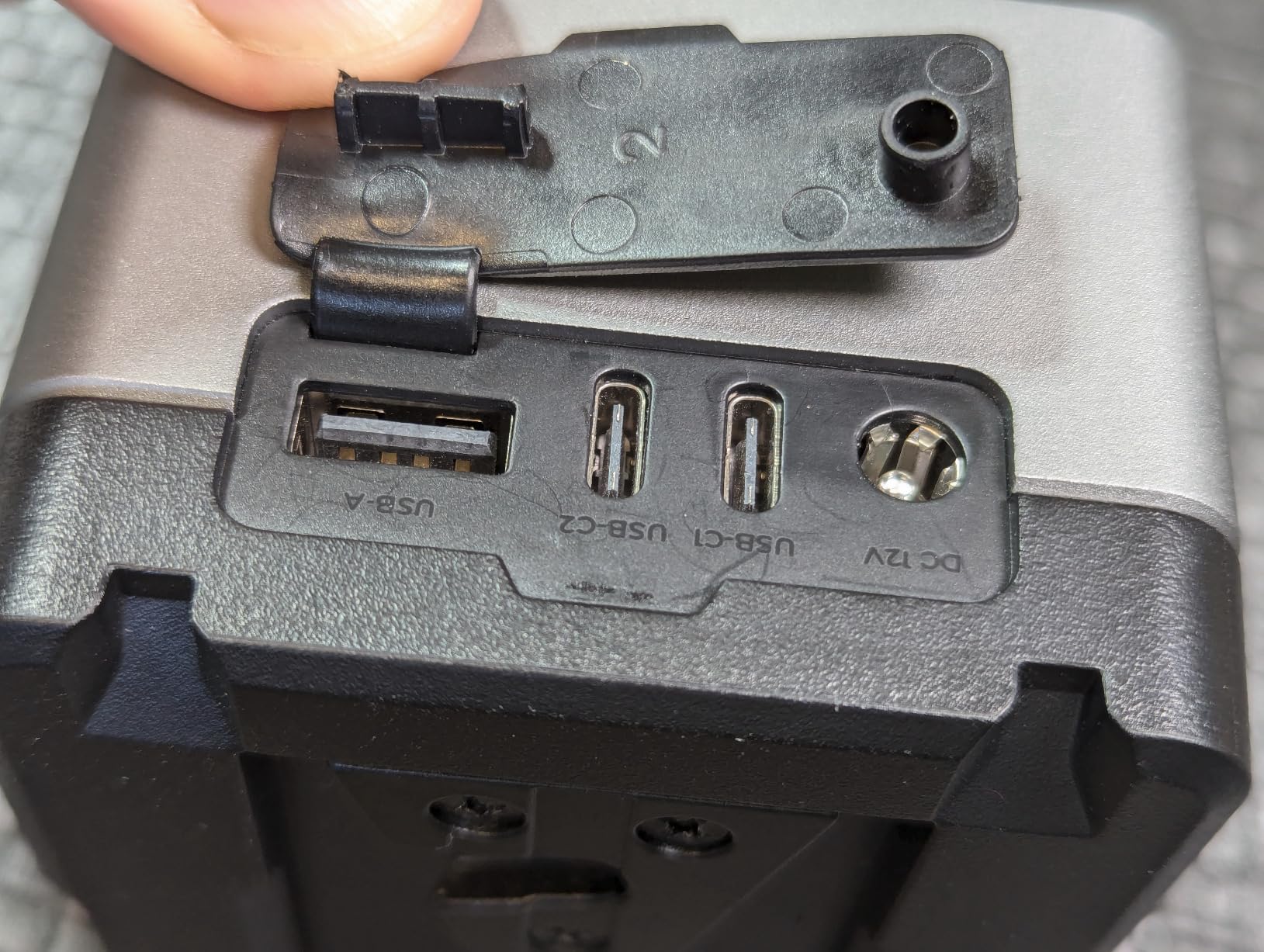 Bovenaan zitten: één USB A; twee USB C-aansluitingen, waaronder supersnel opladen (100 W); en een 12V DC-aansluiting. Het deksel voor de D-Tap-aansluiting komt eruit en zit op een klein staafje - als je dit draait, zit het deksel uit de weg. De bovenste klep heeft echter een andere verbinding en je kunt hem niet zo ver bewegen, waardoor hij in de weg zit.
